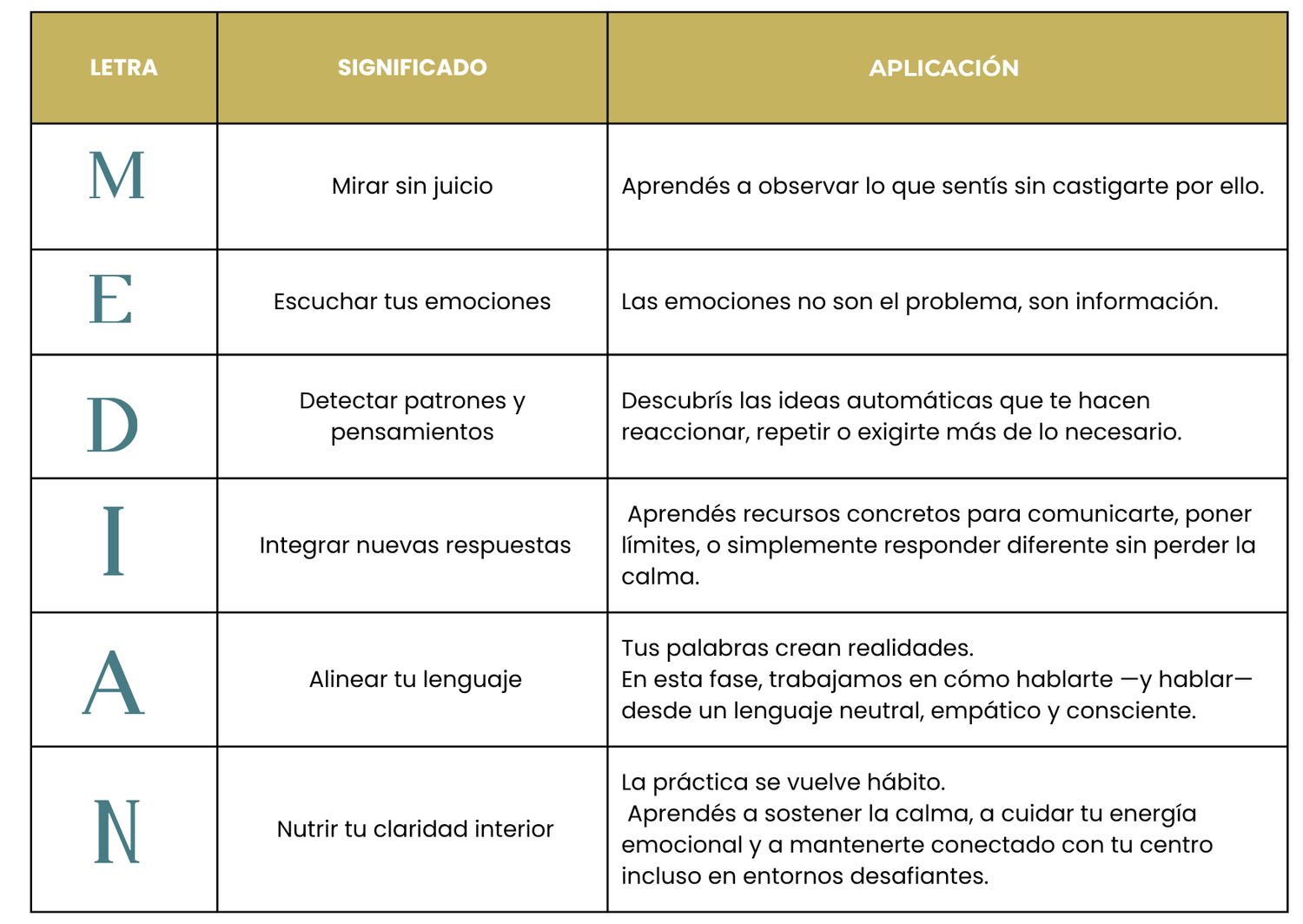 Reencuéntrate es un acompañamiento uno a uno de 90 minutos donde aplico mi método MEDIAN®, una guía emocional y práctica para ayudarte a comprender lo que te pasa y encontrar maneras simples de responder distinto.